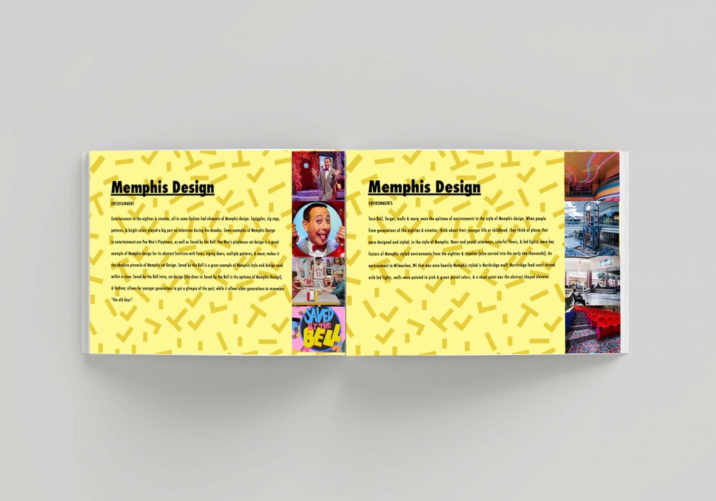Memphis design is a design style that originated in the eighties. Memphis design is centered around bright colors, shapes, & wacky designs. This brochure gives information on the history, fashion, entertainment, & environments. I use my layout & design skills to create the brochure; & mocked it up additionally. This brochure can be used to educate or help graphic designers and graphic design students, to learn about different styles they could apply to their designs.