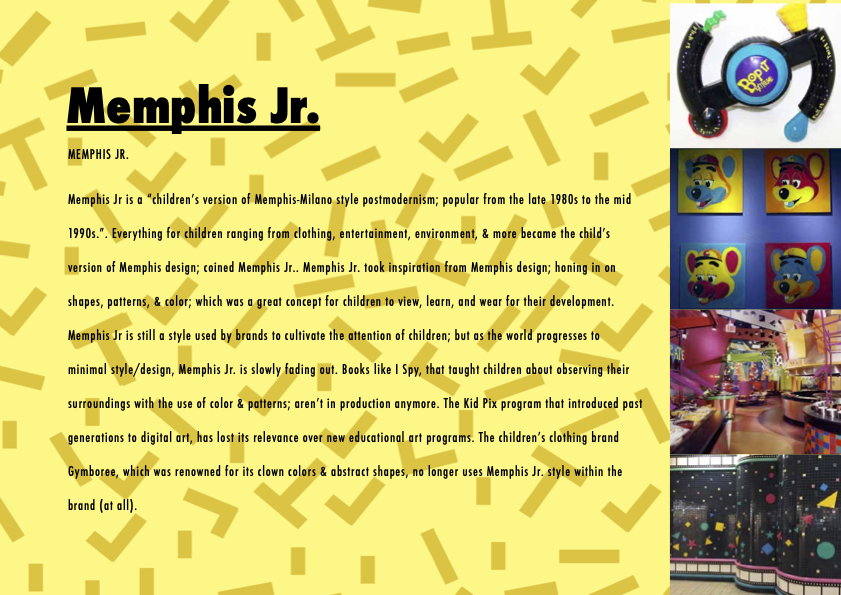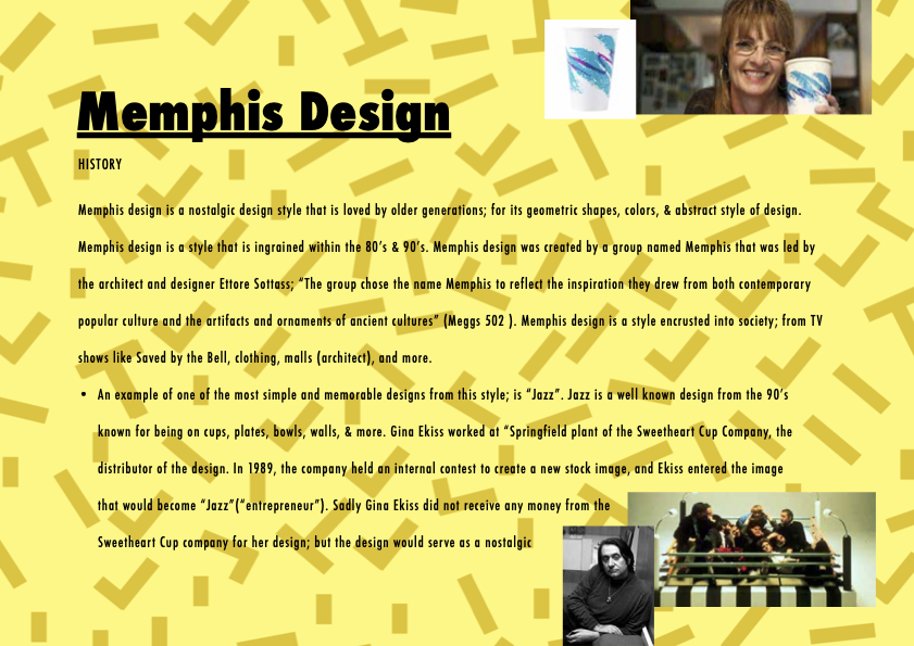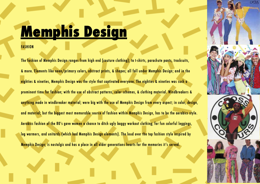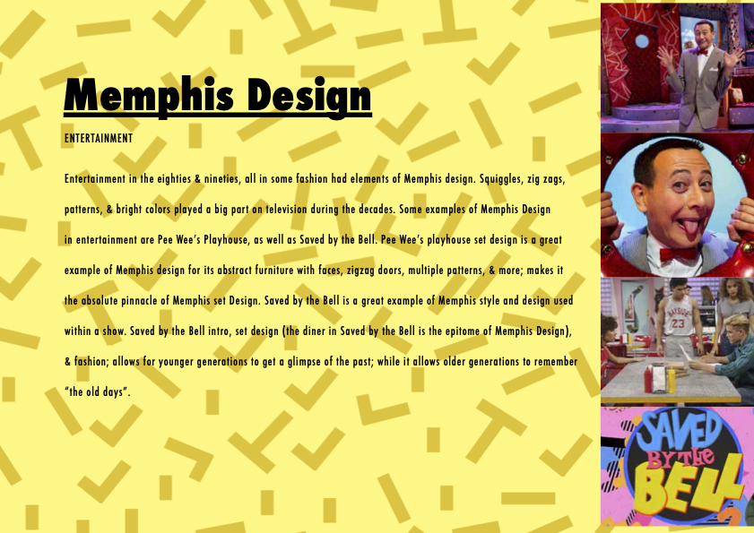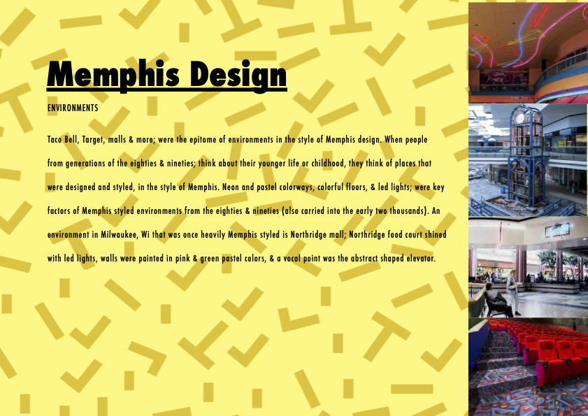 Memphis design is a design style that originated in the eighties. Memphis design is centered around bright colors, shapes, & wacky designs. This brochure gives information on the history, fashion, entertainment, & environments. I use my layout & design skills to create the brochure; & mocked it up additionally. This brochure can be used to educate or help graphic designers and graphic design students, to learn about different styles they could apply to their designs.