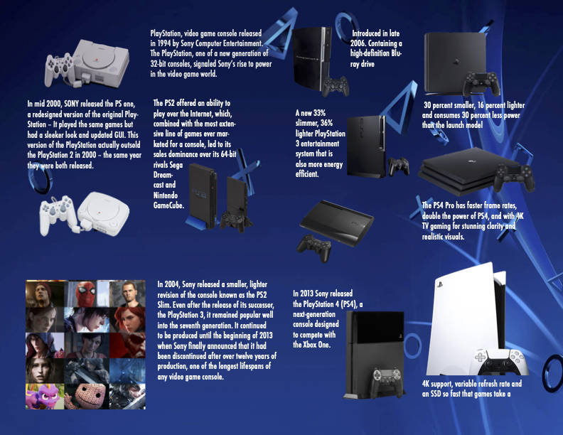 Playstation has graced generations with new & innovative technology for gaming. As someone who grew up on all of the Playstations; I thought it would be important to showcase the growth of the console from the original to the newest model. I created this brochure by utilizing Playstation’s brand & history; to show the timeline of Playstation as a brand & a product.